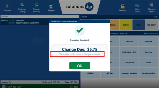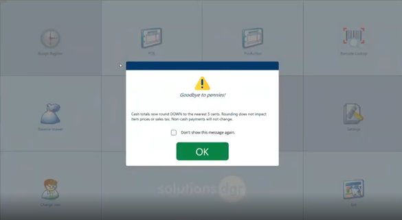 After rounding is enabled and configured, cashiers will see a workstation message announcing the change (for example: “Goodbye to pennies!”).
